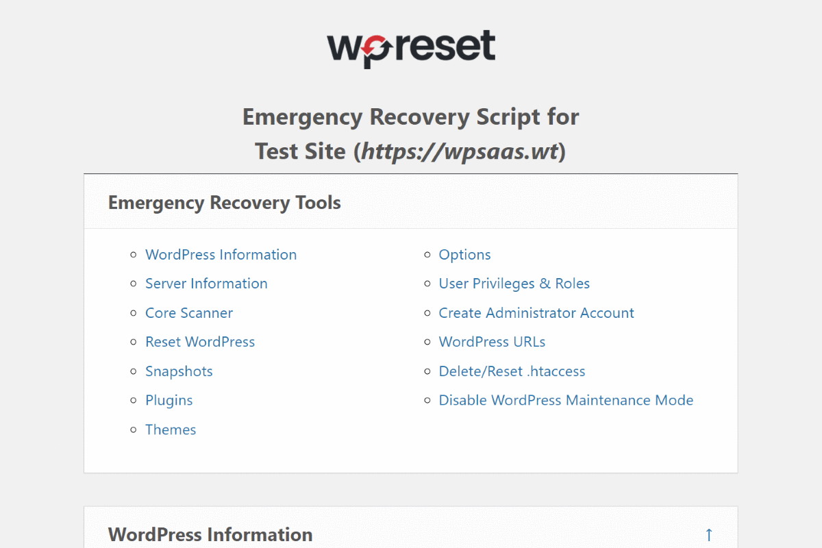 Even if you can’t access your site admin, you can use WP Reset’s Emergency Recovery Script to reclaim your website.