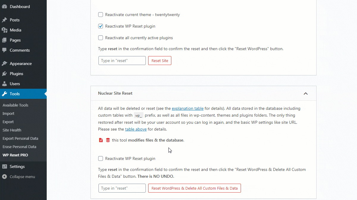 - Wp reset dashboard