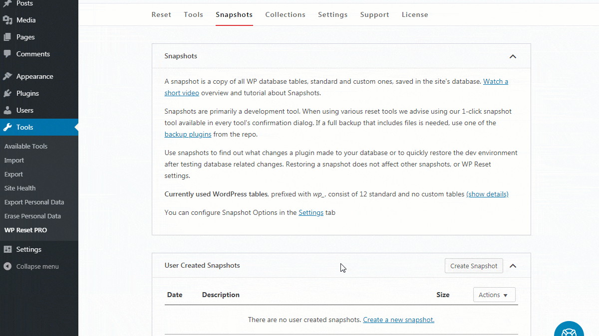 You can also automate the process by letting WP Reset automatically take Snapshots depending on certain actions and events.